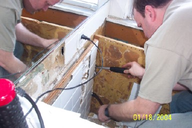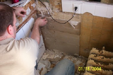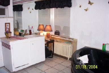 Well, after Sherry painted the tiles white in this room, and added curtains, nothing much changed. Until Sunday January 18, 2004. This is when I started hearing noised from upstairs, banging, stuff falling. Tiles falling. It seems that with the recent cold weather, Sherry decided to 'uncover' the radiator in this room from its own little box. Turns out it was a little more work than originally thought.