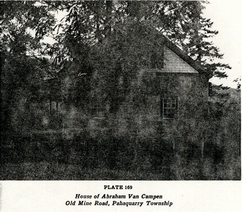 House of Abraham Van Campen Houses in Sussex and Warren Counties Old Mine Road, Calno, Pahaquarry Township, Warren County Extracted from "Pre-Revolutionary Dutch Houses and Families in Northern N.J. and Southern N.Y.," by Rosalie Fellows Bailey, 1968; pages 545-548 and 579. This house was built by Abraham Van Campen far from any settlement in the wilds north of the Delaware Water Gap. To reach civilization he had to make a long and arduous journey over the Old Mine Road northwards along the Delaware River to the present Port Jervis and then strike inland northeastward to Esopus on the Hudson River. Abraham's grandfather Gerrit Jansen Van Campen emigrated to New Amsterdam, where he was a soldier at the time of his marriage Jan. 17, 1659, to Macktelt Stoffels, widow of Anthony Lodewyck. They settled at Esopus. Their son John Van Campen, bap. April 18, 1661, at Kingston, married there July 23, 1687, Tietje Jans Decker, and survived most of their eleven children. They were living at Shawangunk when two of their children were born in 1694 and 1696, and by 1703 had settle in Marbletown Township, Ulster County, where they were living as late as 1728. He removed to New Jersey and died in Somerset County in 1745 shortly after making his will (in which he does not mention his son Abraham). Of his sons, John, Gerrit and Abraham settled along the Delaware River. Col. Abraham Van Campen, bap. Oct. 9, 1698, at Kingston, was the first and most prominent settler of the river region, now Pahaquarry Township. This land was included in the Indian's release of 1713 to the West Jersey Proprietors. On March 8, 1732, Abraham bought from the heirs of George Hutcheson, one of the Proprietors, a tract called Pahaqualin, consisting of 1666 acres with a stretch of seven miles along the Delaware River, for £735. This tract was the upper half of the present township; it could not have been his first purchase, as he was said to have had a survey made for him in 1712 and to have settled here about 1725. John Reading, Jr., surveyed the country as far as the Minisink lands in May of 1715 and recorded no white settlers at this time, but the valley was thickly settled for over thirty miles north of the Water Gap by 1730, according to the surveyors Scull and Lukens. Abraham Van Campen at one time owned more than 3000 acres, of which he sold a great deal, leaving 1600 acres to his sons. Richard Smith of Burlington rowed down the Delaware River in a canoe with Indian guides in 1769, and recorded that "we had a glimpse of the late Col. Van Camp's place below Walpack; he has a good share of even land and a range of swelling hills proper for sheep pasture, as much of all this country would be if it was cultivated." On the map of the Delaware River Survey in 1769 by Dennis are shown Van Camp's House and Grist Mills on a stream. Abraham's home was the headquarters of the settlers in the Delaware River valley during the Indian wars; a fort was built nearby for a garrison of 250 men, and the officers were fed at his table. He was a Colonel of the West Jersey troops in the French and Indian War of 1755-58, and ordered by Gov. Belcher to have his regiment ready to march into Pennsylvania and repel the Indians before they had the opportunity to march into New Jersey. The Indians stood in great dread of him. As Justice of the Peace he performed any marriages in this section. He was a Judge of the Court of Common Pleas and by far the most prominent man in the Delaware River region. Abraham was married twice, first to Susanna Depue, bap. Jan. 9, 1698 at Kingston, still living in 1754, a daughter of Moses De Puis and Marretje Wynkoop and sister of Nicholas and Benjamin Depue who were the first settlers of Smithfield on the Pennsylvania side of the Delaware River. On Oct. 29, 1761 he married secondly Rachel Van Aker widow (probably spouse of Isaac Van Aken), by whom he had no issue. He died in May, 1767, having made his will the year previous as a resident of Walpack in Sussex County (Walpack Township at this time included the whole region along the river south to the Delaware Water Gap). Abraham and Susanna's three daughters were: Maria, b.l 1732, wife of John Depui, Catherine wife of Benjamin Depui, and Susanna wife of Thomas Romine. Of their four surviving sons, John, b. 1726, and Benjamin, b. 1728, settled on the opposite side of the river at Smithfield on tracts willed them by their father, and the other two, Abraham, b. 1736, and Moses, b. 1743, lived on their father's homestead. Moses Van Campen (1743-1819) was a Major: he was captured one night in 1777 by three Indians, who planned to take him to the headquarters of the Susquehanna and murder him by a lingering torture, but he was able to burst his fetters asunder, kill two of the Indians with a tomahawk and put the third to flight. Moses married Sarah Westfaal but had no children and willed all his property to his nephew Abraham III, son of Abraham, Jr., after the decease of his wife Sarah. Abraham Van Campen, Jr., bap. Feb. 22, 1736, at Kingston, d. May, 1811, married first about 1752 to his cousin Maria, daughter of Moses Depue, and secondly Elizabeth Schoonmaker. Only two of his children matured: Abraham by the first marriage, b. July 12, 1770, d. Nov. 28, 1848, married Sarah Cape and had six children; James by the second marriage, b. Nov. 17, 1781, d. 1826, married Cecelia Decker and had eight children. Abraham Van Campen, Sr., had made no mention of the homestead in his will of 1766, but by deed of Nov. 26, 1766 he conveyed it to his son Abraham, Jr., who in his will of Feb. 23, 1808 bequeathed the home in which he lived to his son James. It was at the home of James Van Campen that a town meeting was held March 14, 1825 to establish the civil organization of Pahaquarry Township. In the first half of the nineteenth century the place passed into the Ribble family: to Wiliam Ribble, then to his son George, then to the latter's son William R. Ribble. The latter's widow, Cecelia V